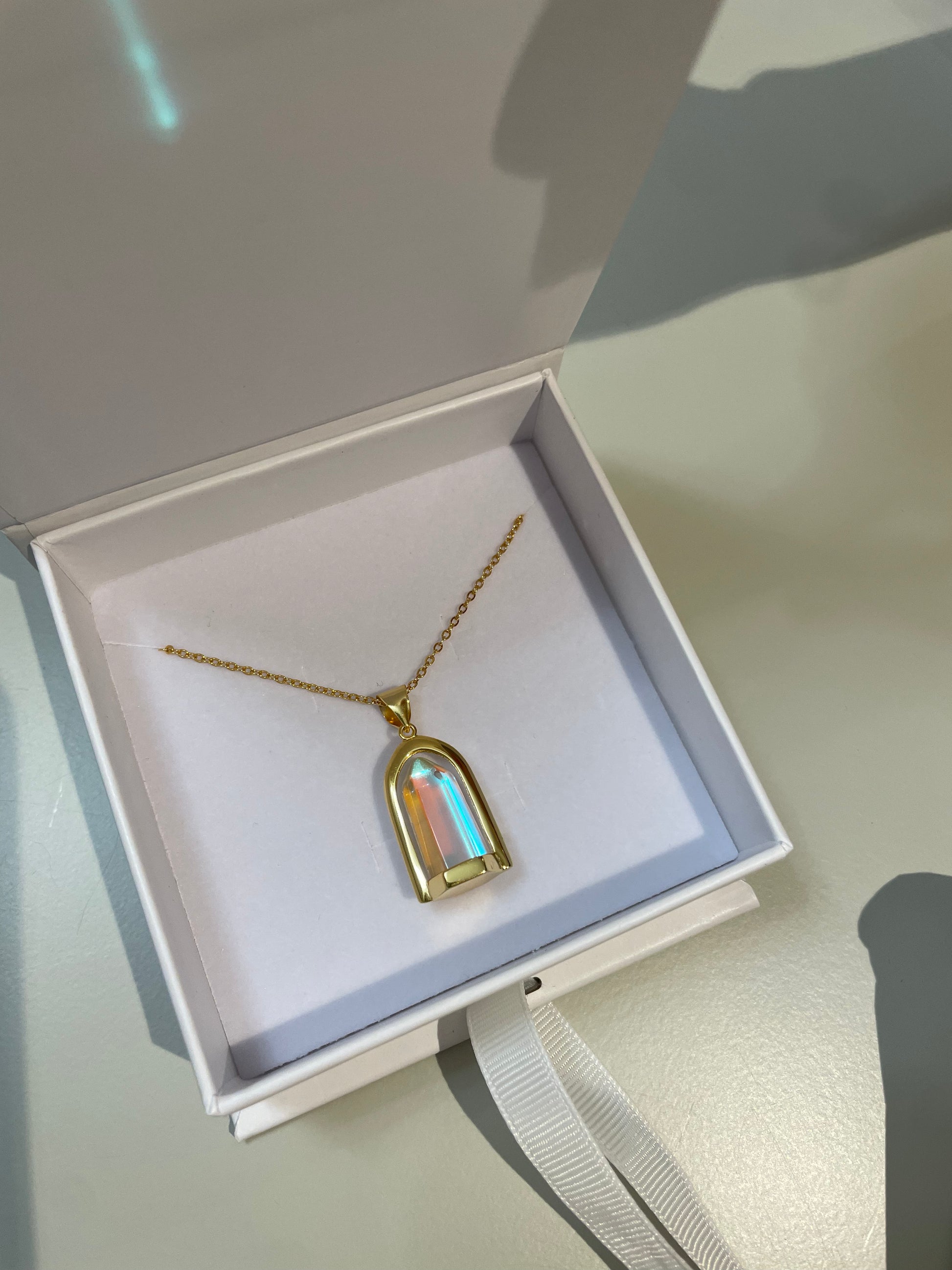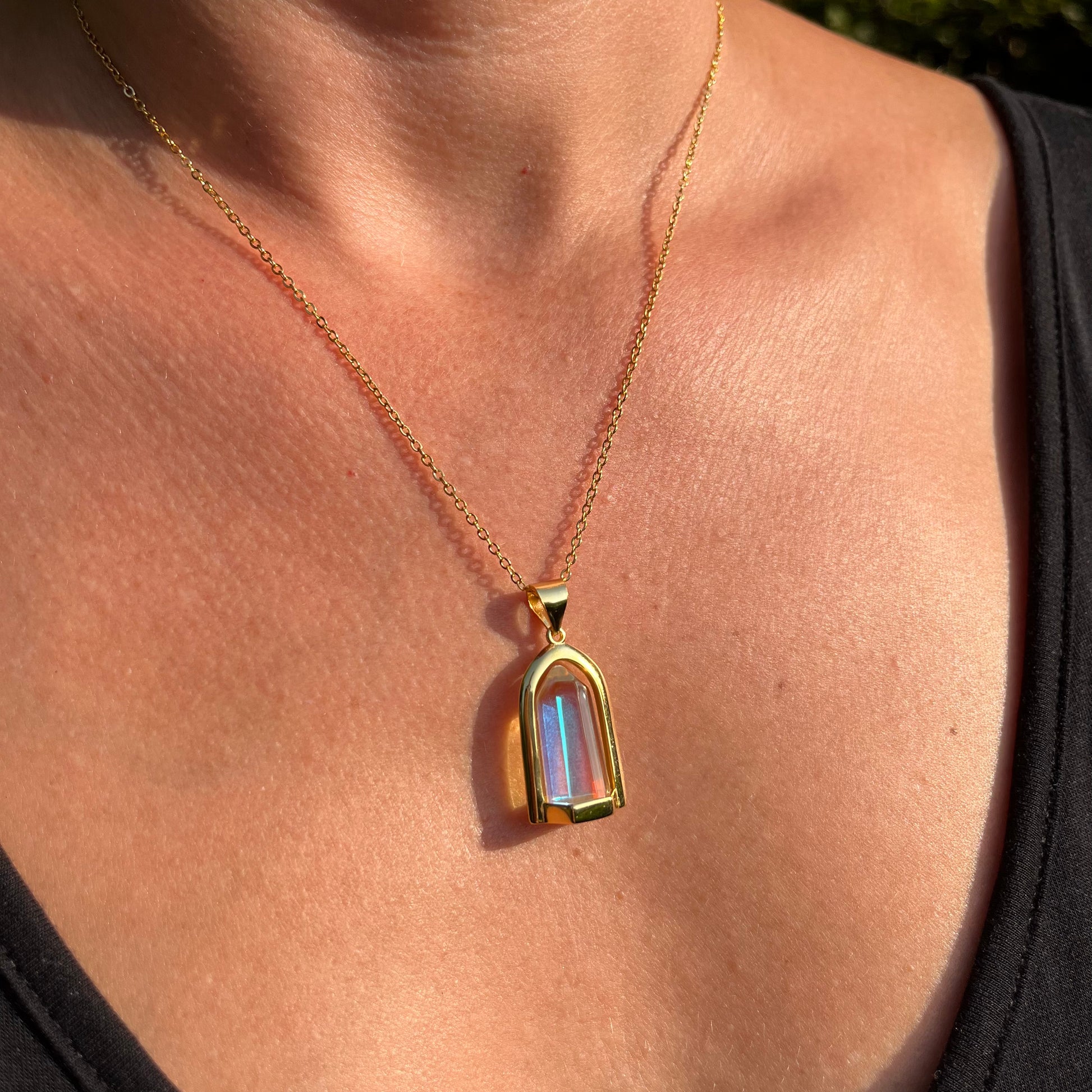 Each piece is hand-cut and set in a sleek, minimalist dome frame of 18k+ gold-plated over sterling silver. Suspended on a fine chain, the pendant floats just below the collarbone, timeless, luminous, and full of meaning.
