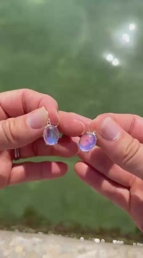 Delicate yet full of presence, these handmade oval cabochon earrings feature luminous rainbow moonstone, each one naturally unique, with soft iridescence that shifts beautifully in the light.